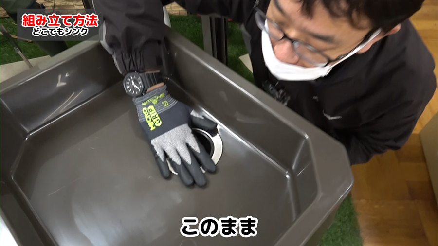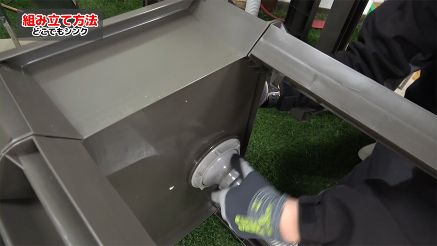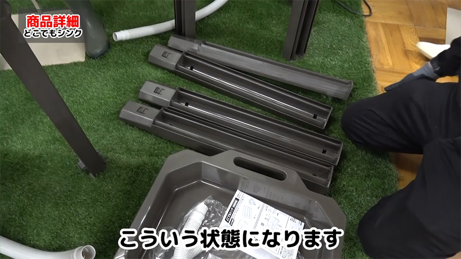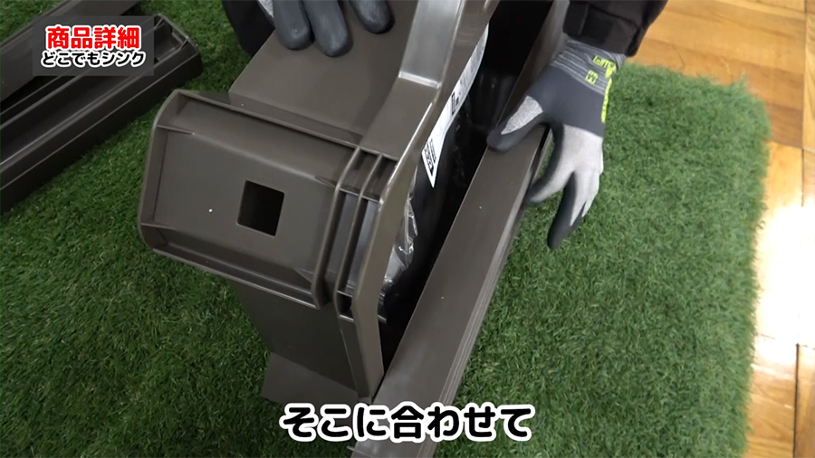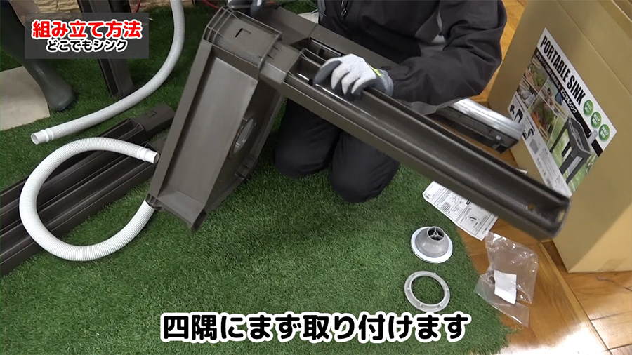 ①まず、脚4本をシンクの四隅に取り付けます。工具不要で差し込むだけで組み立てができます。