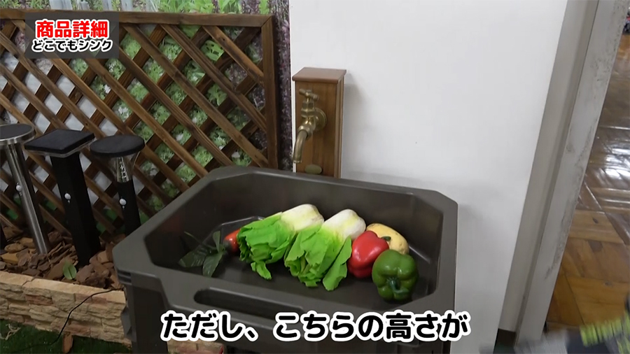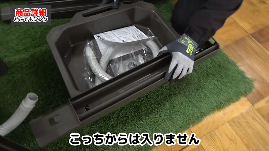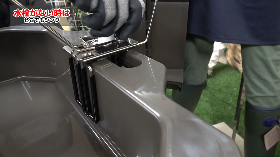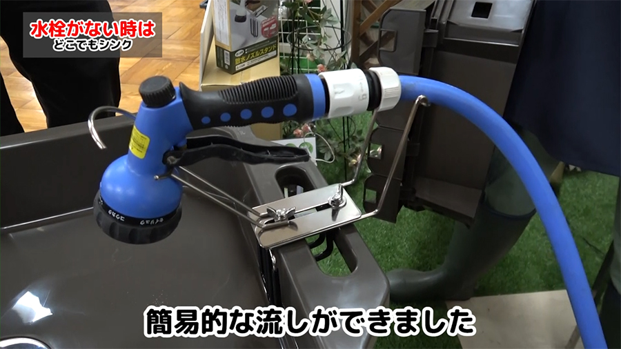 スタンド部分に散水ノズルを置いたら、簡易的な流しができます。