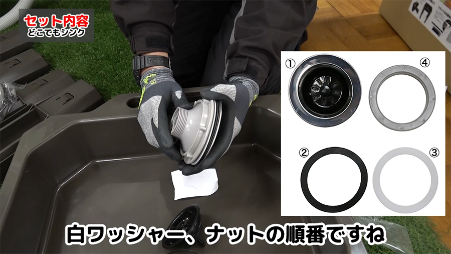 排水パーツの組み立て順番は①ゴミ受け②ゴムパッキン③白ワッシャー④ナットで取り付けます。