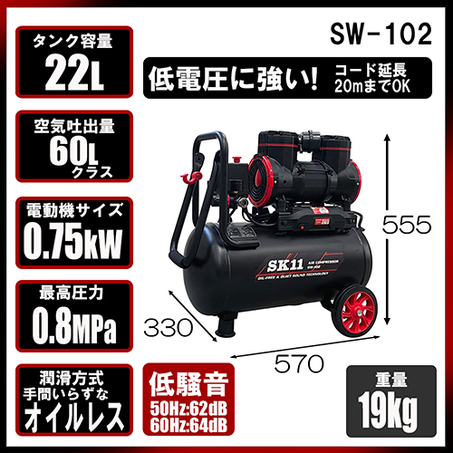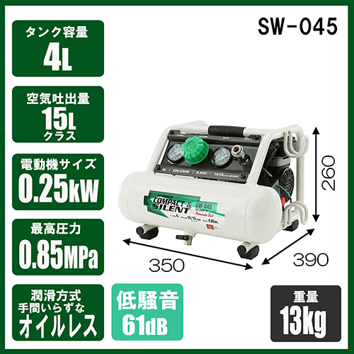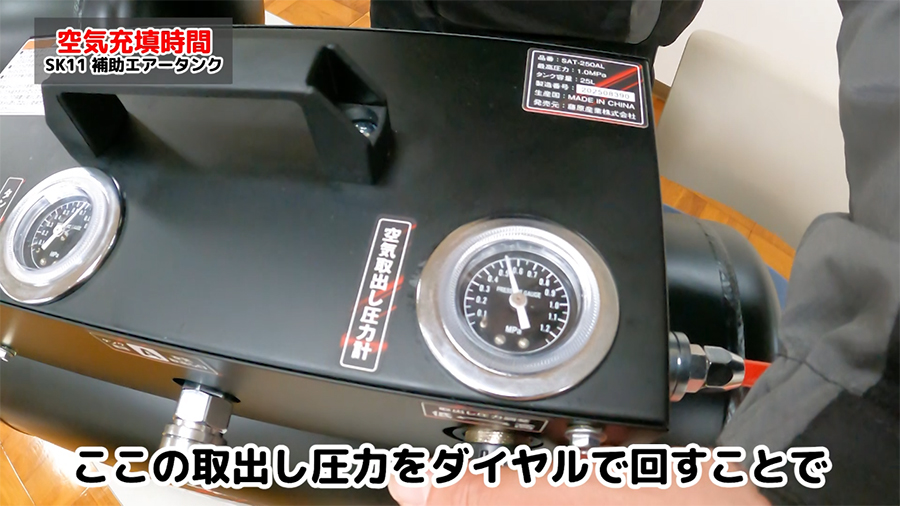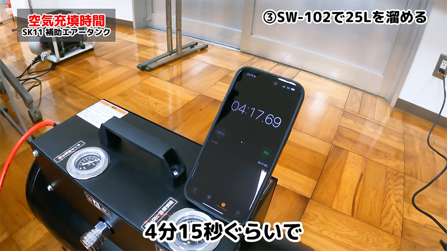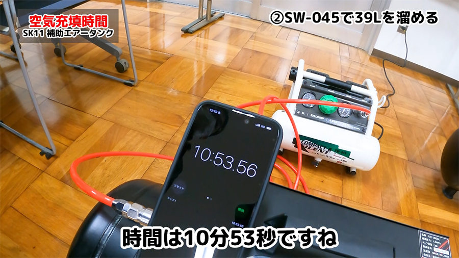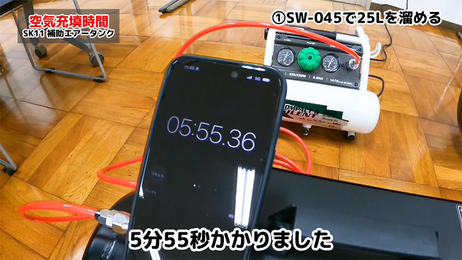 SW-045は空気吐出量が15Lクラス、SW-102は空気吐出量が60LクラスなのでSW-102の方が早く空気が溜まりました。