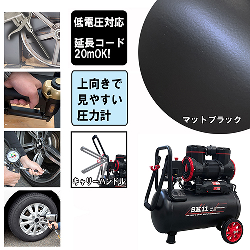藤原産業の静音タイプのエアコンプレッサーは従来、白ボディが多かったですが、SW-102はマットブラックとカッコイイ色合いとなっています。