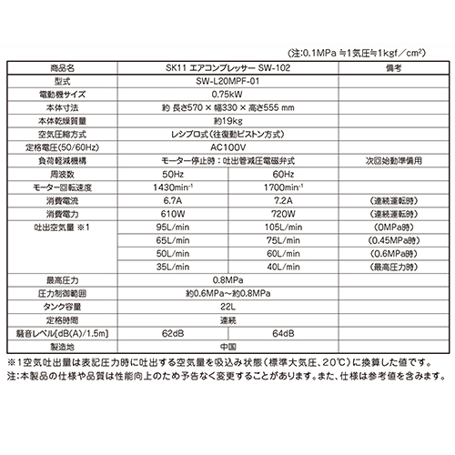 タンク容量は22L、潤滑方式は手間いらずのオイルレスタイプ、コード延長は20mまでOKです。騒音値(作動音)は50Hzでは62dB、60Hzでは64dBとなっています。(機体端面から1.5m)