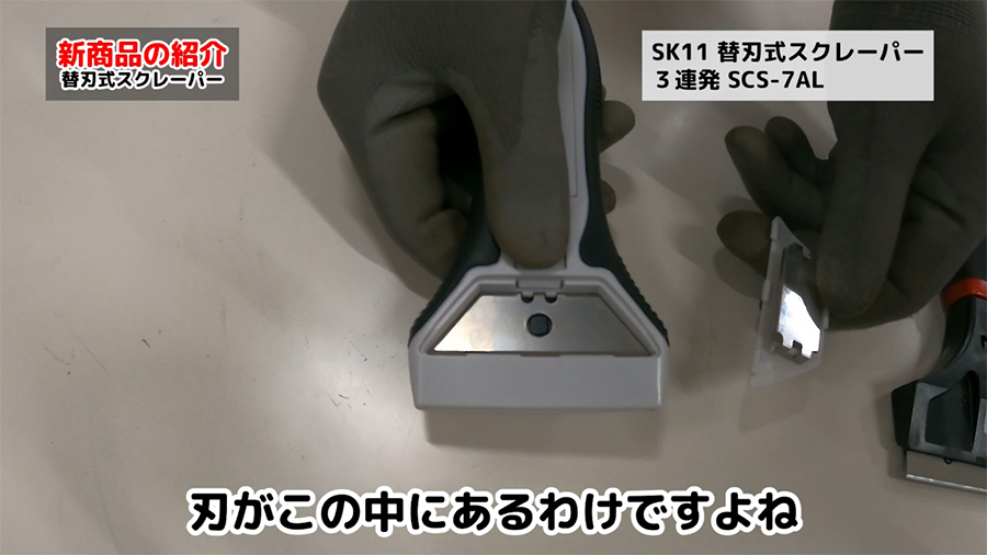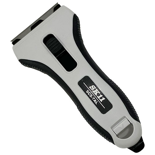 新商品のSK11 替刃式スクレーパー3連発 SCS-7ALは刃幅が約60mm、刃の出し入れができるタイプです。押し出すと刃が出てきます。