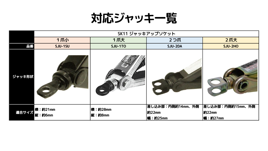 ジャッキの形状によって対応しているジャッキアップソケットは異なります。