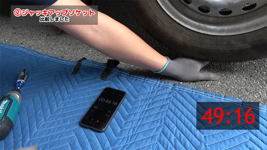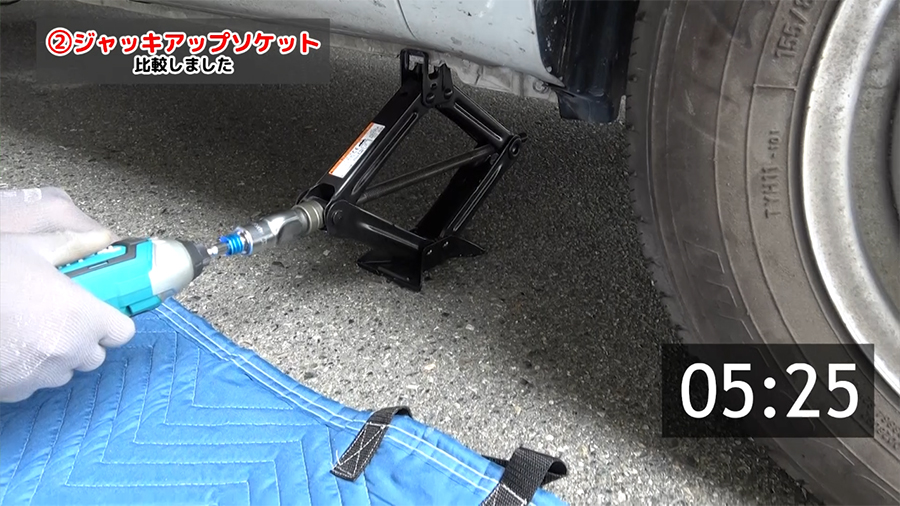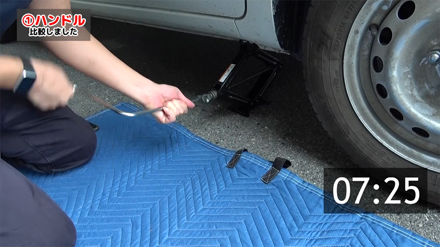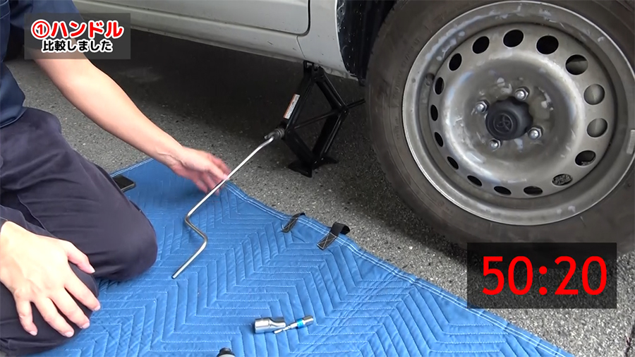 車に装備されている純正車載ジャッキについているハンドルとジャッキアップソケットをそれぞれ使ってジャッキが上がるまでの時間と使用感についてみていきます。