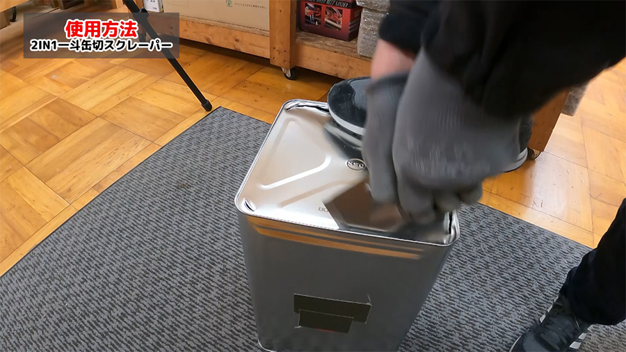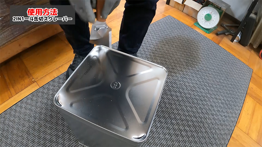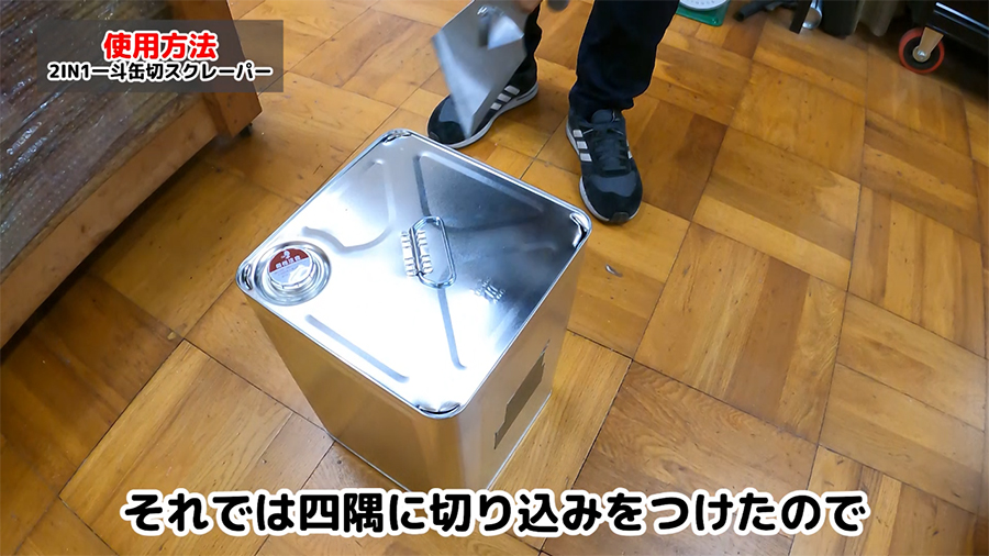 スクレーパーの小さい刃の部分で一斗缶の四隅に切り込みをつけます。