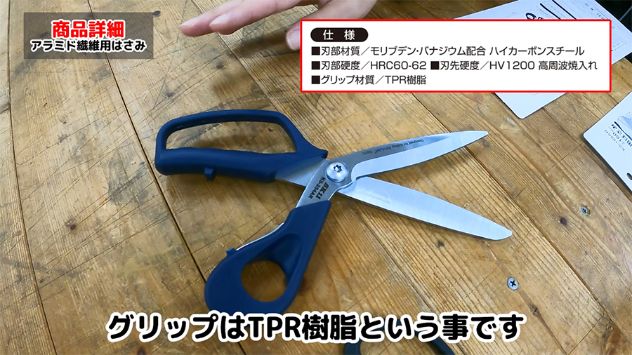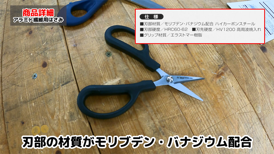 クラフト用はさみだと刃部の硬度はHRC50-54なのでアラミド繊維用はさみの方が硬いことが分かります。