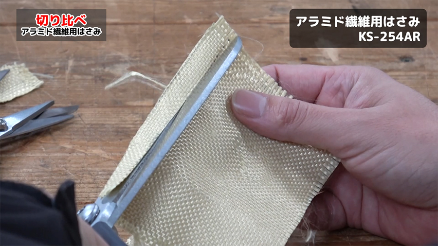そこで登場したのはアラミド繊維専用のハサミです。刃長が短いKS-160ARと新発売の刃長が長いKS-254ARがあります。