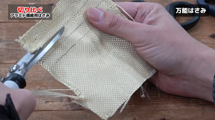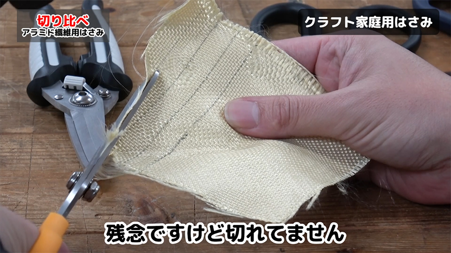 実際にクラフト用はさみ、万能はさみ、アラミド繊維用はさみで切り比べてみました。