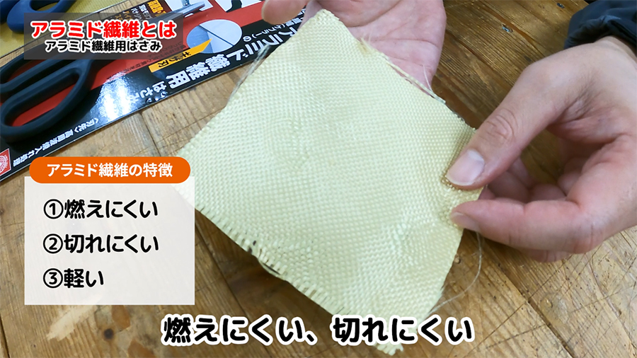 アラミド繊維は燃えにくく、切れにくく、軽い繊維です。イメージしやすい物としては防弾ベストや防火カーテン、防火服・消防服、スキーウェアなどの補強部に使われたりしています。