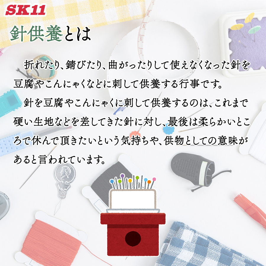 12月8日は「針供養の日」です。針供養とは、折れたり、錆びたり、曲がったりして使えなくなった針を豆腐やこんにゃくなどに刺して供養する行事です。
