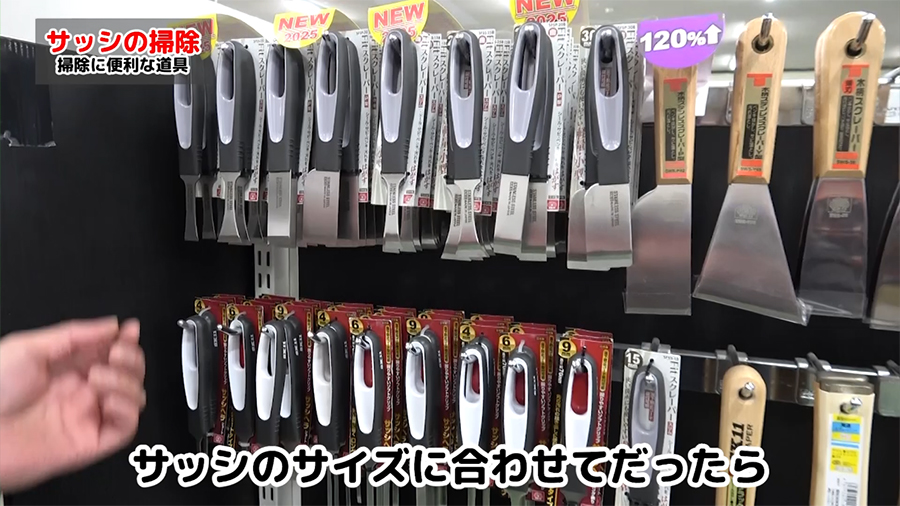 サッシの溝のお掃除に便利な商品はサッシヘラという商品です。幅が小さく4mm~30mmのものがあります。