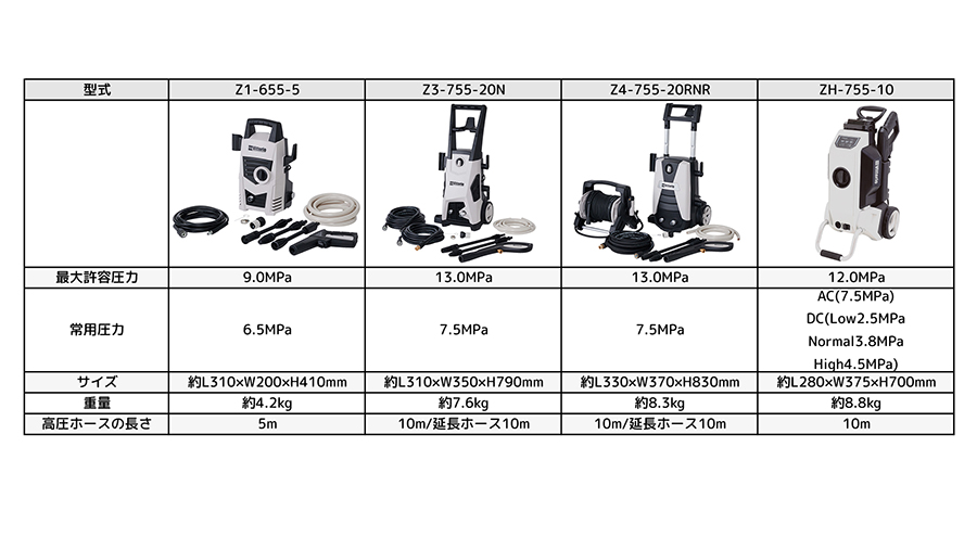 仕事で使用頻度が高い方にはZ3-755-20NとZ4-755-20RNRがオススメです。スペックはもちろん、高圧ホースが10m、延長ホースが10m付いているので広範囲で使用ができます。