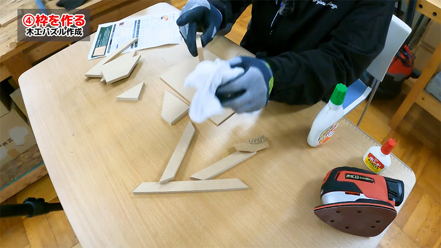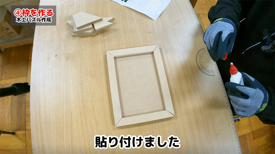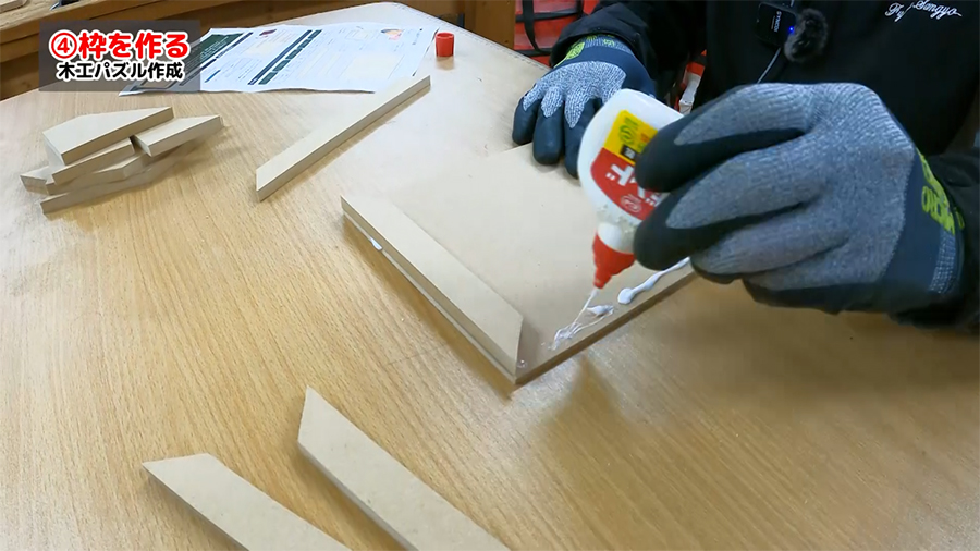 木くずをはらい終わったら、板に接着剤を塗って枠のパーツを貼り付けます。