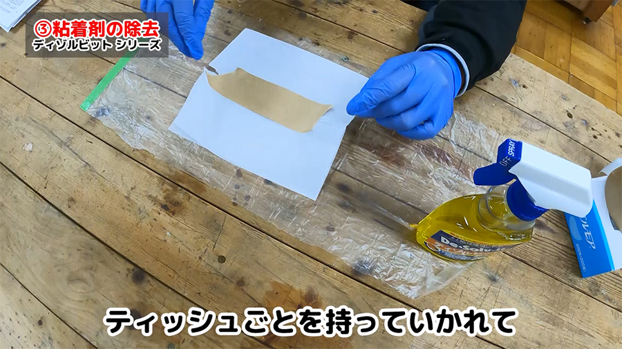 ディゾルビットを貼り付けた面の反対側に吹きかけてしばらく待つと、ティッシュを破ることなくするっとガムテープが剥がれます。