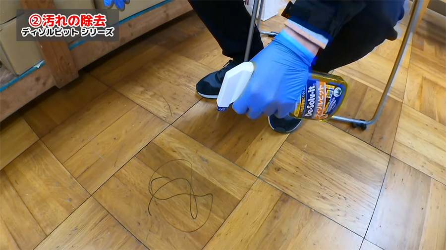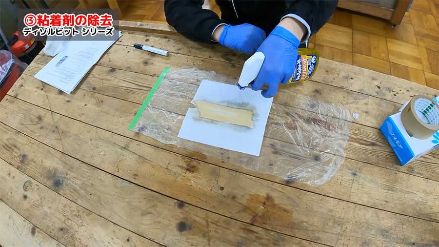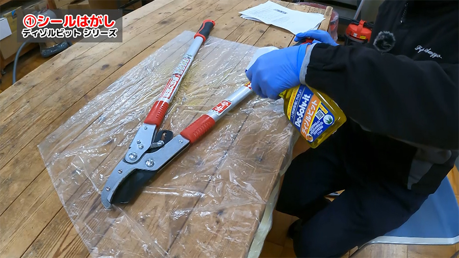 剥がしたいシールにディゾルビットを吹きかけ、しばらく待つとシールを簡単にはがせるようになります。