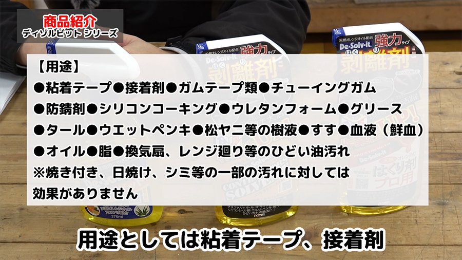 用途としては、粘着テープ・接着剤・ガムテープ類・チューイングガム・防錆剤・シリコンコーキング・ウレタンフォーム・グリース・タール・ウエットペンキ・松脂などの樹液・すす・血液(鮮血)・オイル・脂・換気扇、レンジ廻りのひどい油汚れ※焼き付き、日焼け、シミ等の一部汚れに対しては効果がありません。