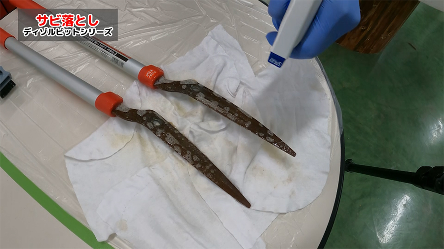 まず、刈込鋏を分解してサビている面にラストリムーバーを吹きかけます。