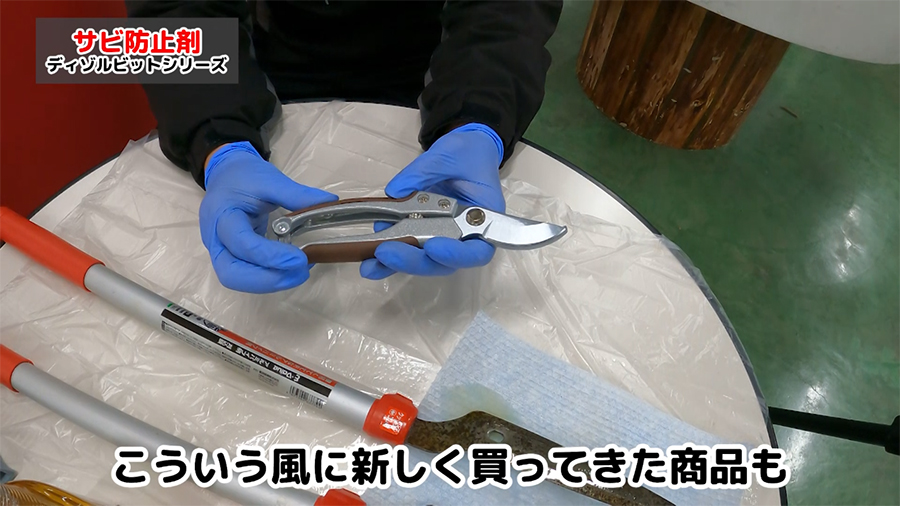 吹きかけて乾かすだけで防錆処理ができます。吹きかけるだけですので、買ってすぐの剪定鋏に使う事ができます。