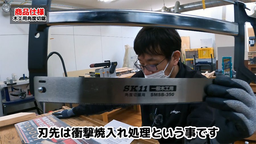 刃は木工用江戸目の小目(寸21枚目)、刃先は衝撃焼き入れ処理が施されています。全長350mm、高さ40mm、ピッチ1.4(寸21枚目)。