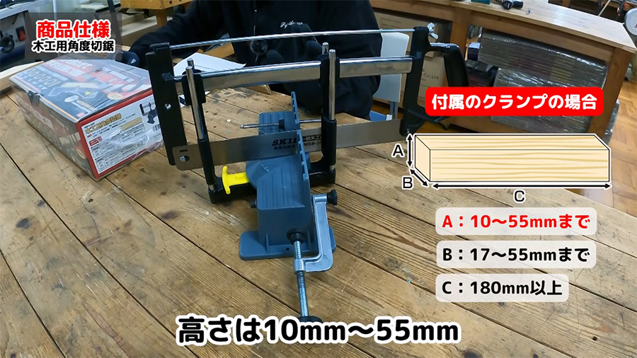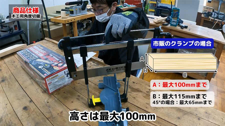 本体付属のクランプを使用した場合の木材の切断可能サイズ:高さ10~55mm・奥行17~55mm・長さ180mm以上。市販のクランプを使用した場合の木材の切断可能サイズ:90度の場合高さ最大100mm・奥行最大115mm(45度の場合奥行最大65mmまで)