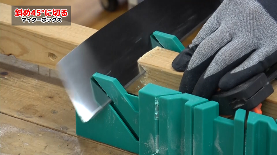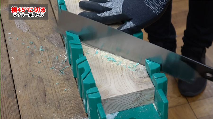 ノコギリをガイドに合わせて切るだけで横90°、45°、22.5°、斜め45°に切断できる優れモノです。