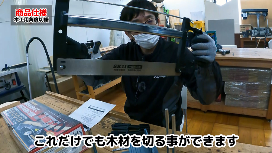 角度を合わせて木材を正確に切断できるノコギリです。ノコギリは取外しできるので、単体でも使う事ができます。