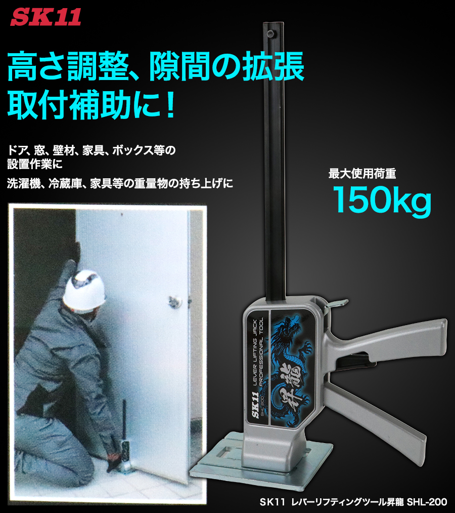 最大使用荷重は約150kgなので、洗濯機・冷蔵庫・家具の持ち上げ、ドア、窓、ボックスなどの高さ調整や水平出しに最適です。