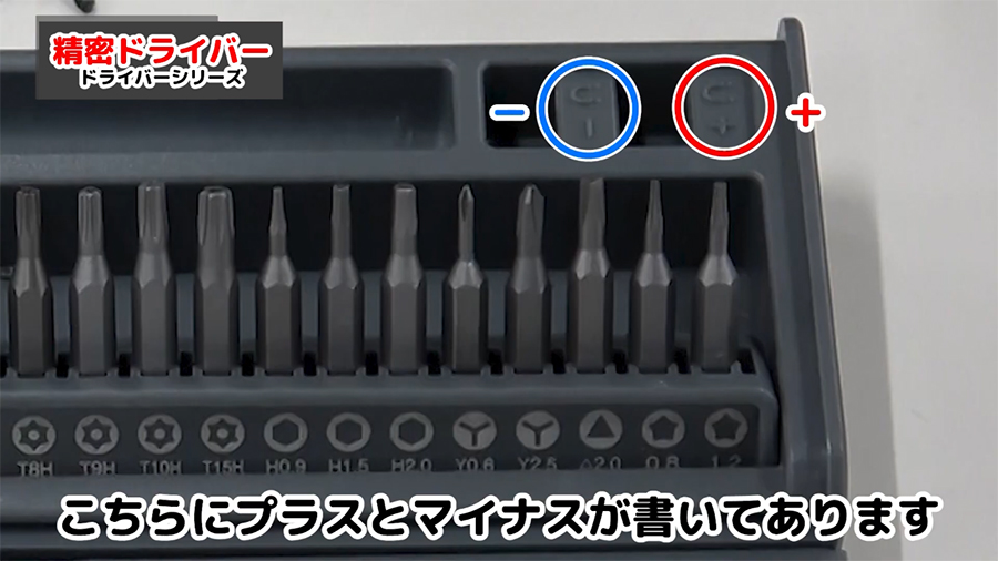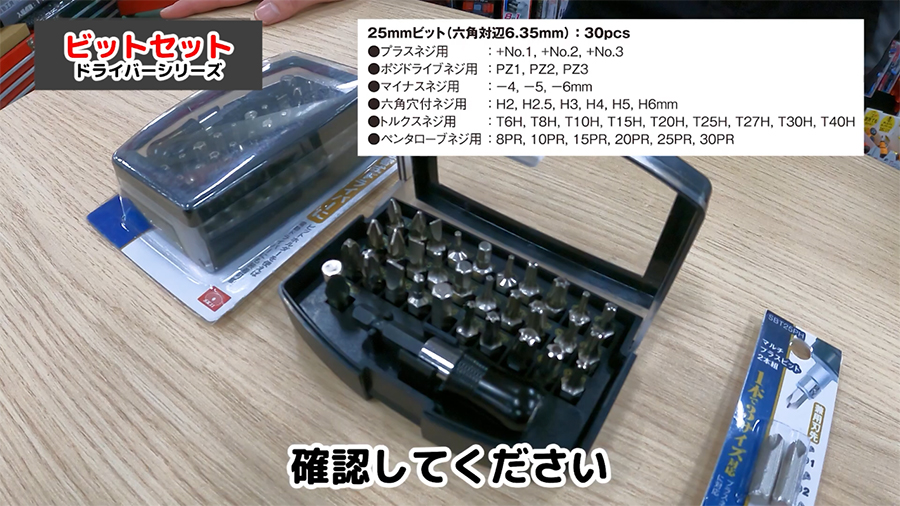 ビットの種類はプラスネジ用が4種類、マイナスネジ用が3種類、トルクスネジ用が9種類、六角穴付きネジ用が3種類、五角ネジ用が2種類、Y型ネジ用が2種類、三角ネジ用が1種類あります。