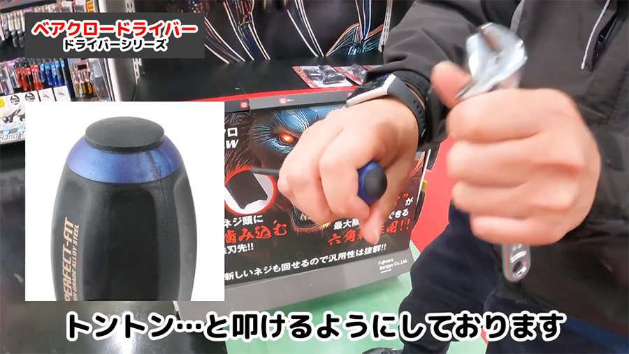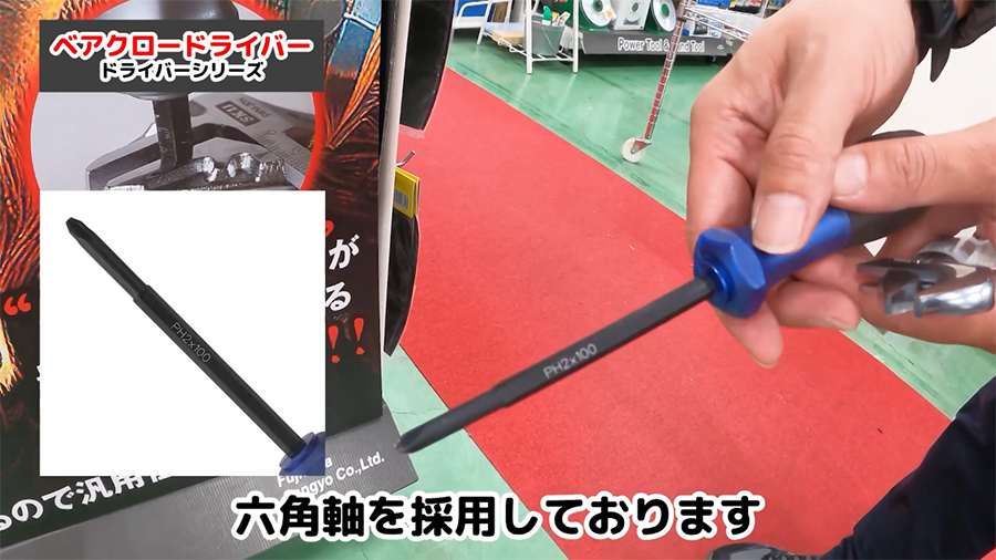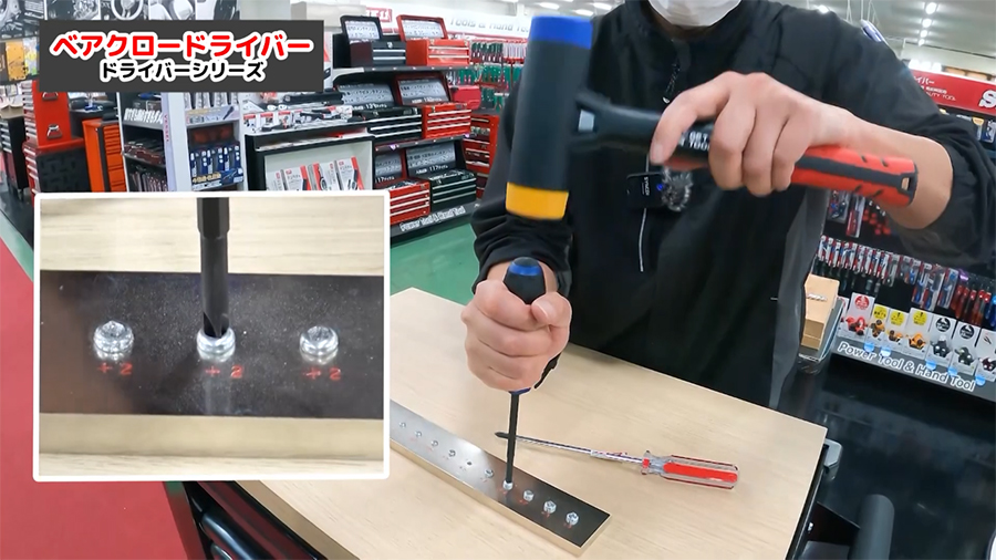 貫通ドライバーなので、ネジを噛み込ませる際に柄の部分をハンマーで叩く事ができます。軸は六角軸なのでスパナなどで回す事ができます。