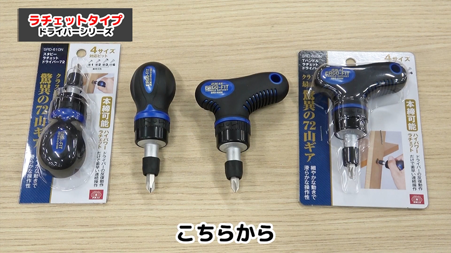 ラチェット式で素早くネジを回すのに特化したドライバーはSK11 スタビーラチェットドライバー72 SRD-610NとSK11 Tハンドルラチェットドライバー72 SRD-620Nです。