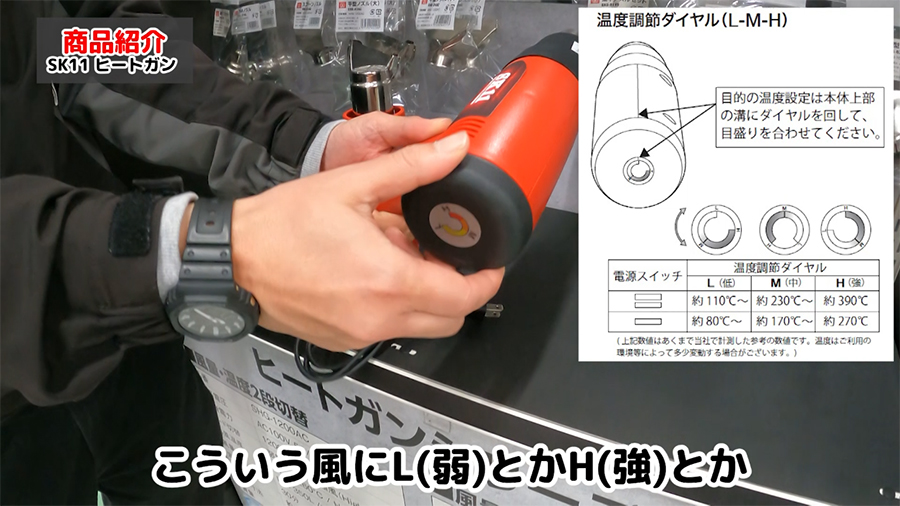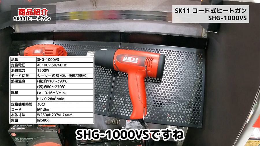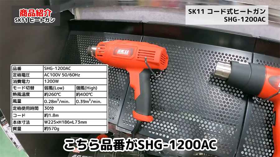 SK11 コード式ヒートガンは強弱2段階調整のみのSHG-1200ACと強弱2段階に加えて温度調整機能が付いたSHG-1000VSの2種類あります。