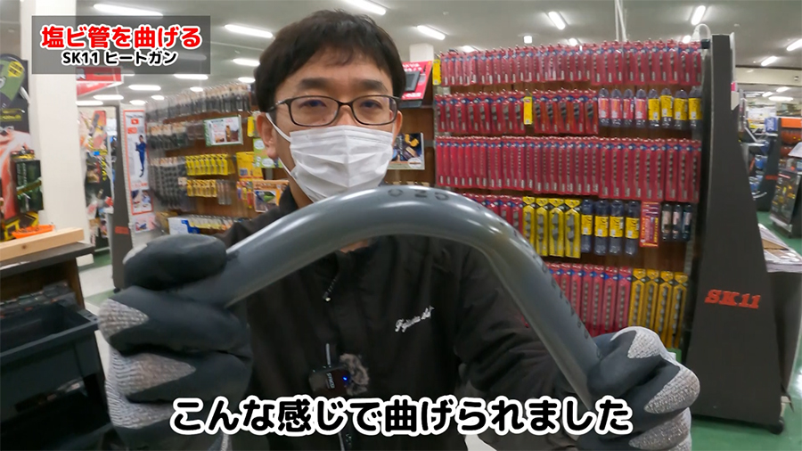 SHG-1200ACで設定温度約260℃(弱)で塩ビ管を曲げていきます。一方向を当て続けると焦げたりする恐れがあるので全体的に温めながら曲げていきます。
