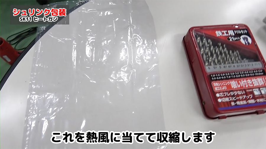 シュリンク包装とは熱で収縮するフィルムを製品の形状に沿ってフィルムを収縮させる包装です。