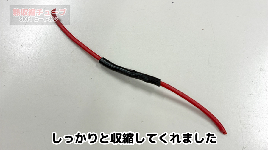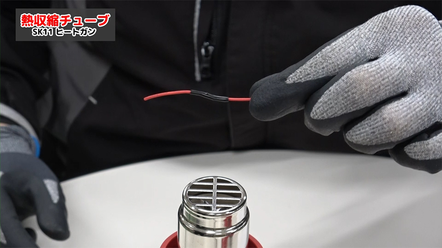 むき出しになった電線接続部分を熱収縮チューブで保護していきます。熱収縮チューブは熱を加える事でチューブが縮むときに対象物の形状に沿って縮む性質を持っています。