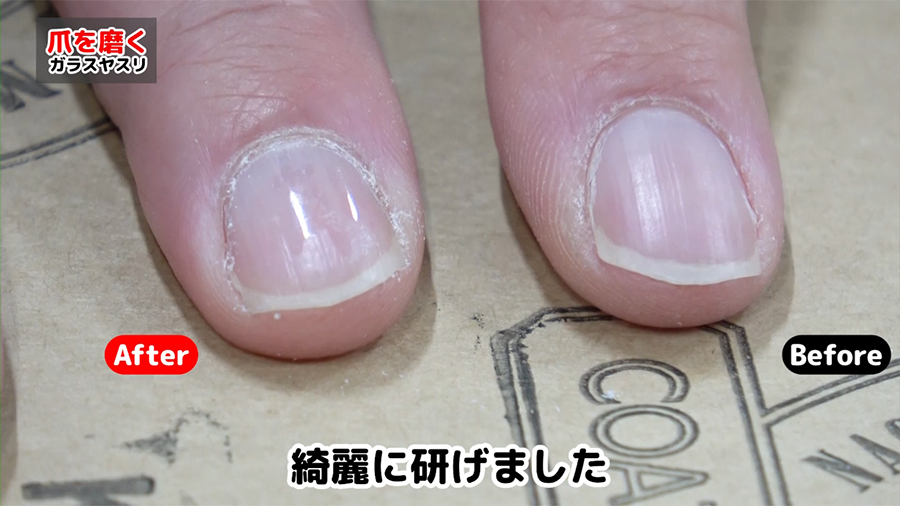 ガラスヤスリで磨いてみると爪の表面がツヤツヤしました。