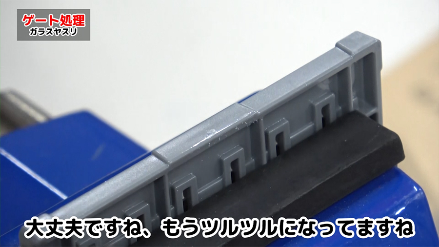 これをガラスヤスリで修正します。撮影の都合上、バイスを使用しました。