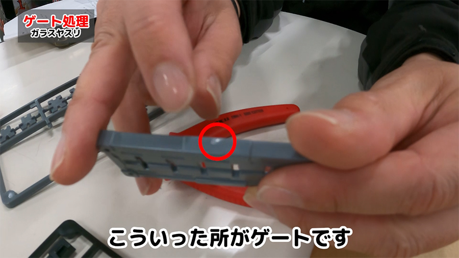 パーツをニッパーで切った後に尖がっているものがゲートです。