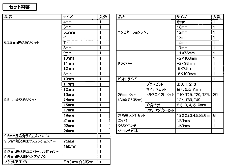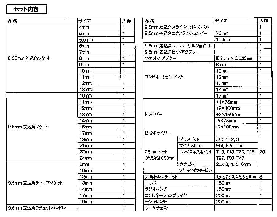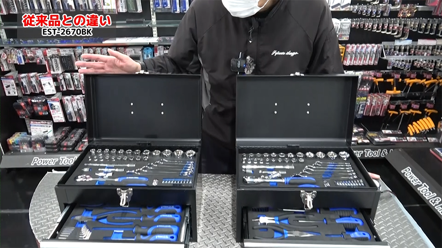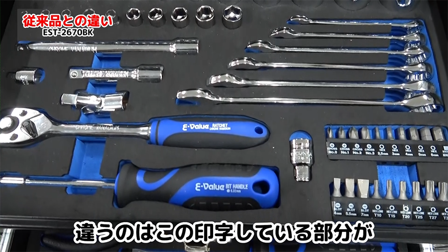 従来品と工具点数は同じですが、工具の収納位置が変わっていたり、工具に印字しているロゴの色などが違います。