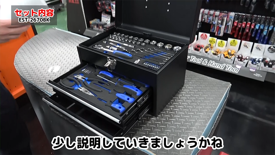 EST-2270BKのリニューアルした整備工具セットです。主に家庭のメンテナンスや家具組み立てなどに使える工具70点が入っています。
