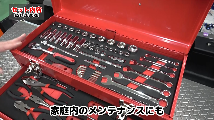 EST-2280REのリニューアルした整備工具セットです。家庭のメンテナンスやバイクや自動車の整備などに使える工具80点が入っています。