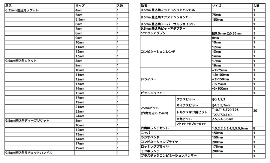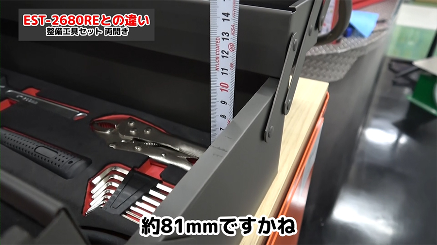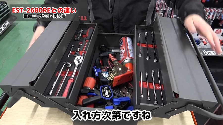 セット内容としては同じですが、両開きのEST-2685GMはプラスで差込角9.5mmのソケットの8mmと9mm、コンビネーションハンマー、ロッキングプライヤ―、コンビネーションレンチの19mmが付いています。