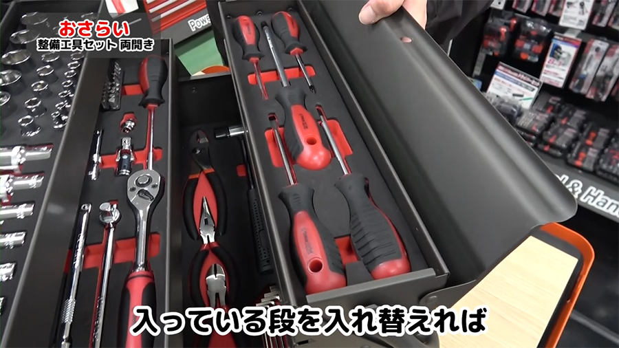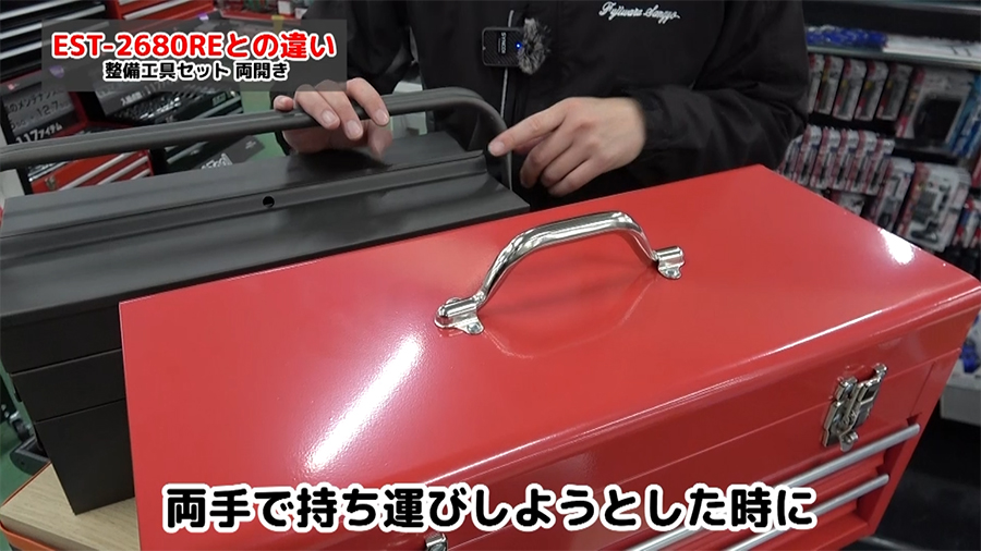両開きなので工具がどこにあるか探しやすく、取り出しやすくなっています。またチェストタイプよりも持ち運びが楽になります。