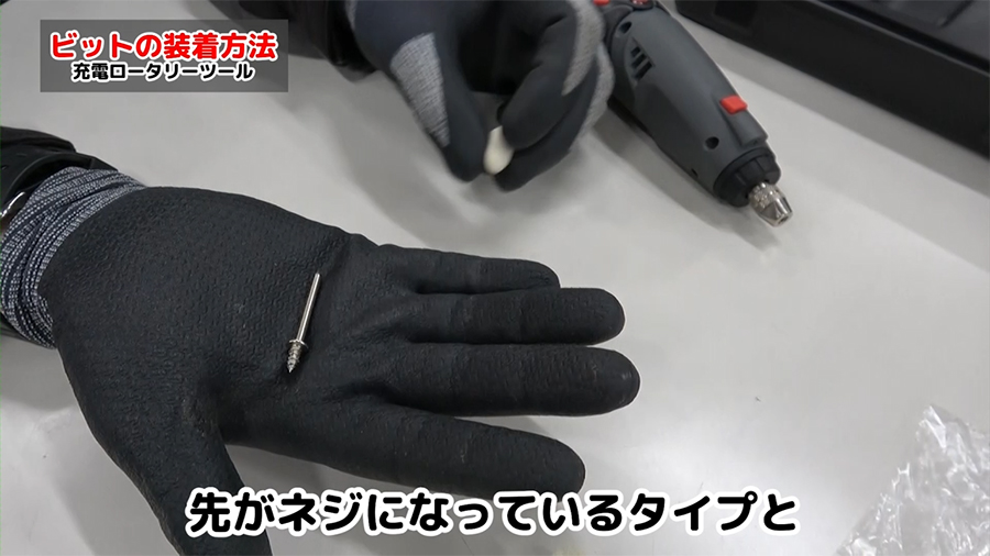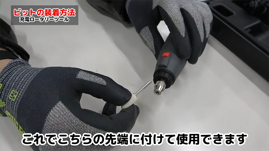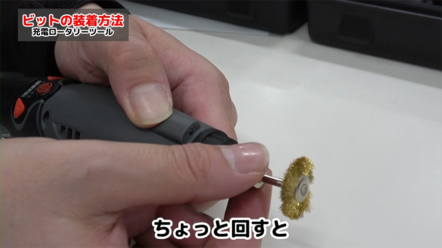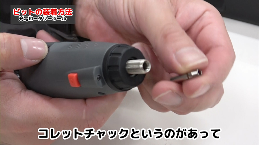 コレットチャックを付けて、チャックを被せた状態でビットを差し込みます。差込ができたらチャックを締めます。