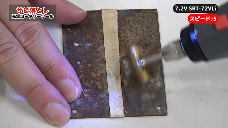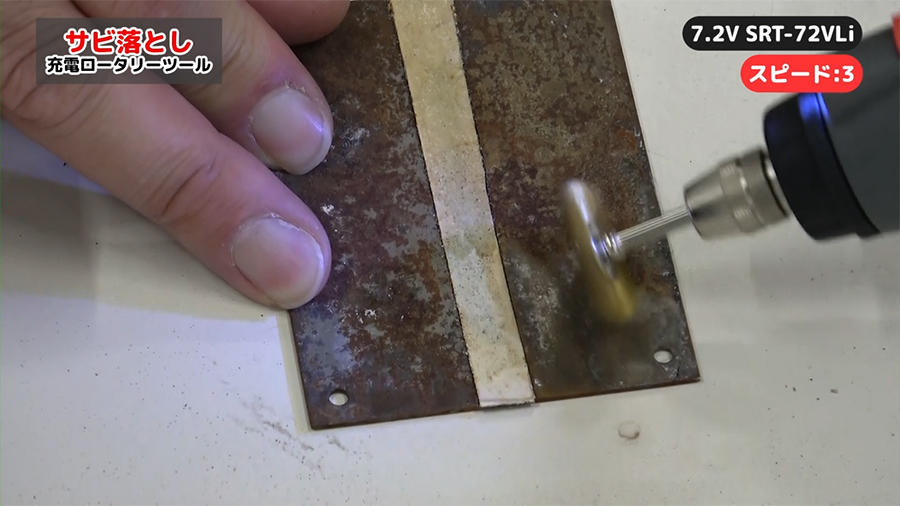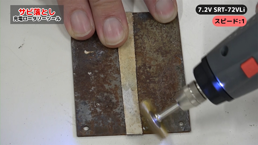 鉄板についたサビをホイールブラシで磨きます。7.2Vタイプは1~5のどのスピードでも問題なく磨けます。回転数を上げれば上げるほど早くサビを落とせました。