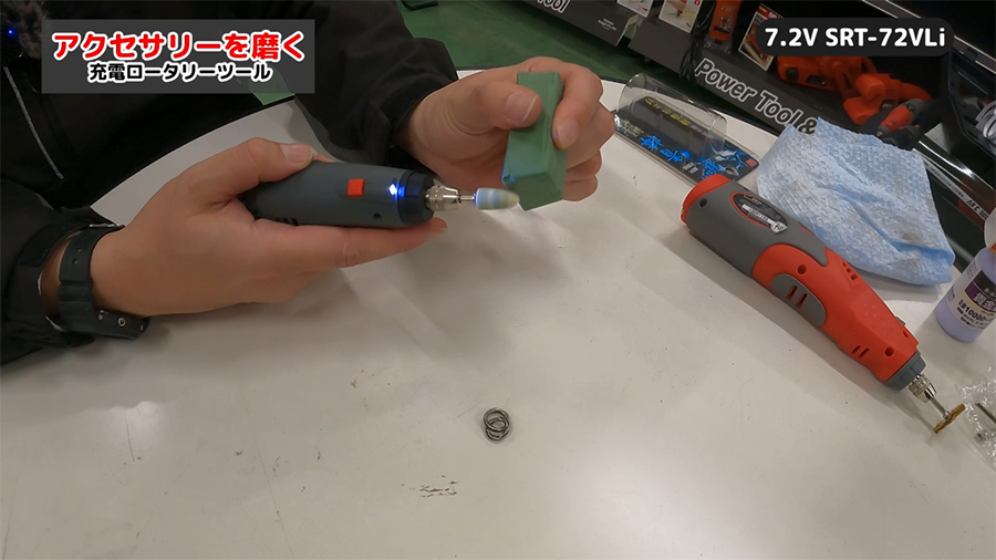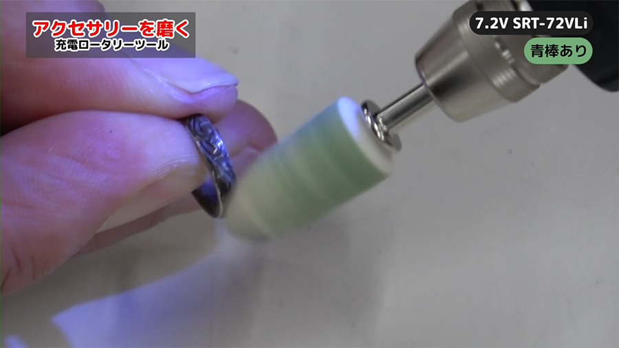 7.2Vタイプで研磨剤はバフ用の青棒を使います。磨き始める前にバフを回転させて青棒をまんべんなく付けます。