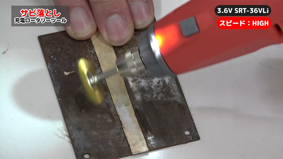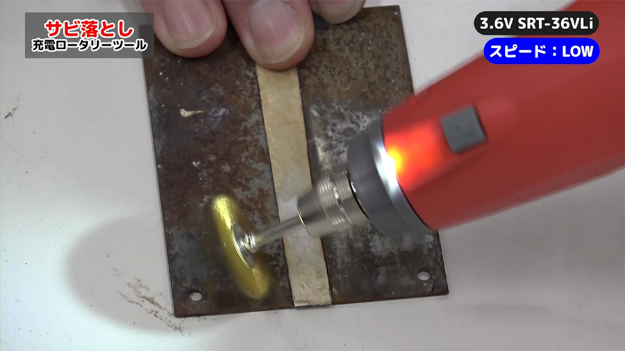 3.6Vタイプはパワーが7.2Vよりも弱いため、削っていく時に負荷がかかると一瞬止まったりしてしまいます。こちらはどうしても時間がかかってしまいますが、LOW/HIGHモードどちらでもサビを落とすことができました。