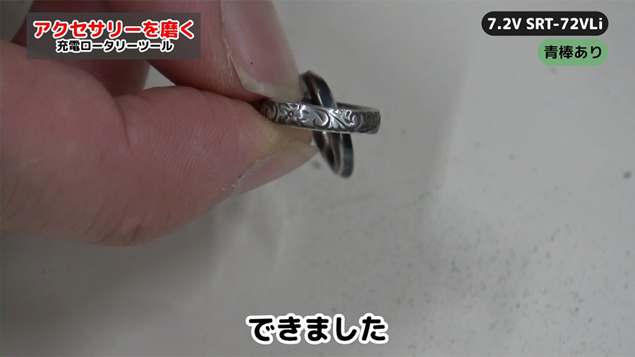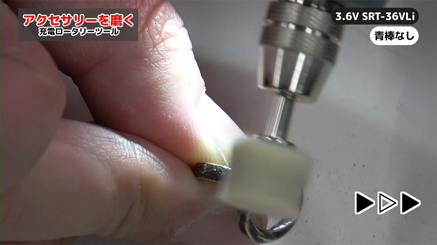 黒ずんだアクセサリーの汚れをフェルトバフで落としていきます。