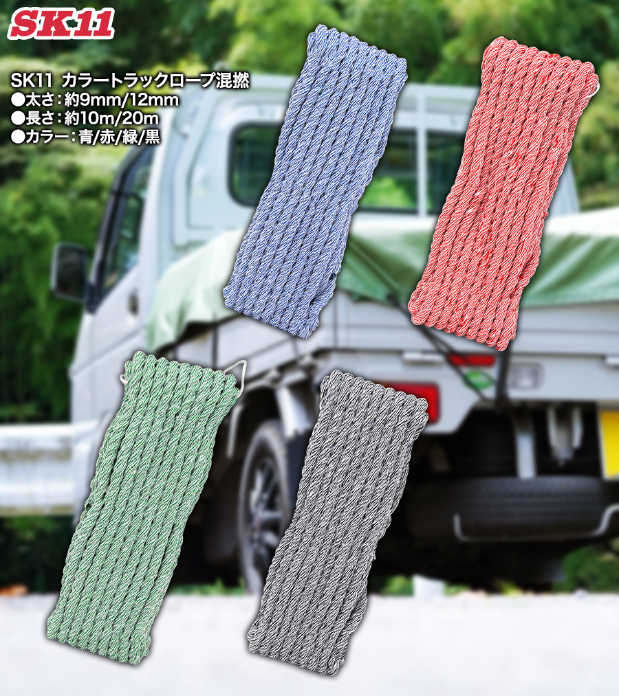 SK11 カラートラックロープ混撚は強度に優れ、軽量でしなやかです。